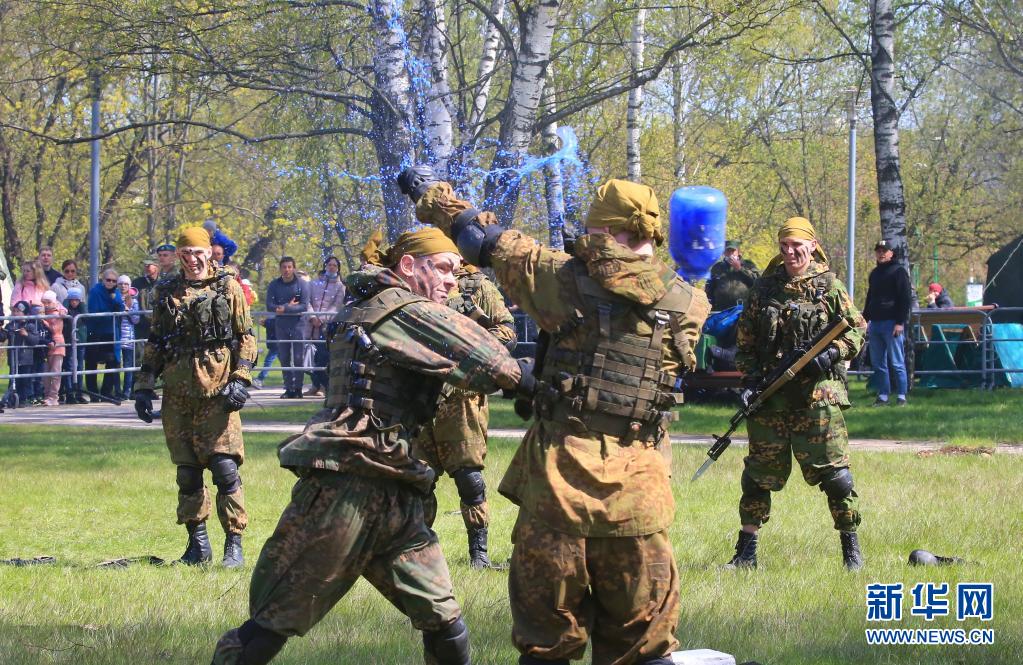 5月9日,軍人在白俄羅斯首都明斯克進行勝利日節慶格斗表演。