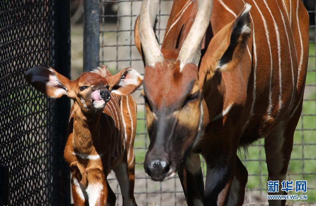 5月10日,兩周大的幼年山地紫羚與母親一起在波蘭首都華沙的華沙動物園的籠舍中散步。
