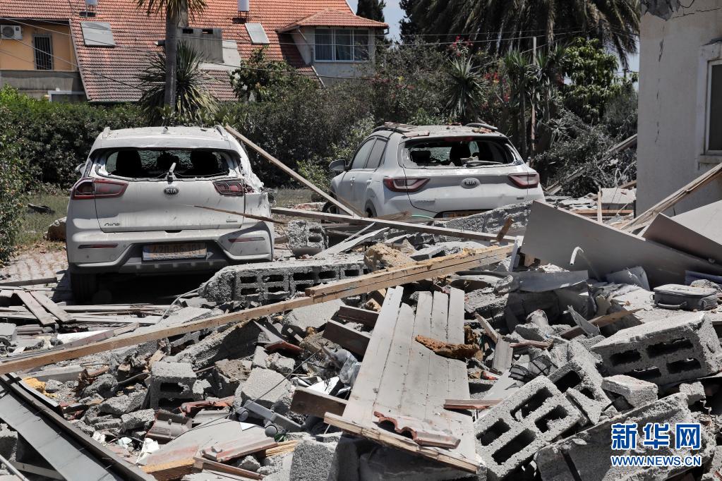 這是5月13日在以色列中部城市耶胡德拍攝的被火箭彈擊中損毀的房屋。