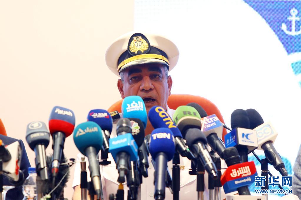5月30日,在埃及東北部城市伊斯梅利亞,蘇伊士運河管理局調查組負責人賽義德·舒愛沙在“長賜”號貨輪擱淺事故調查結果新聞發布會上講話。