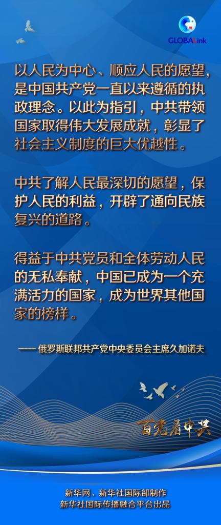 久加諾夫對中國共產黨百年華誕表示祝賀?;仡櫚倌隁v程,他表示,中共了解人民最深切的愿望,保護人民的利益,開辟了通向民族復興的道路。