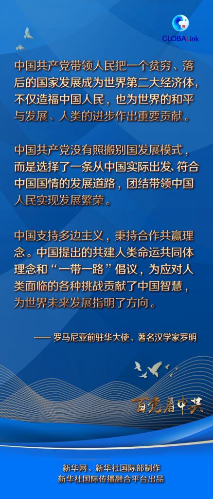 新華社布加勒斯特6月19日電(記者林惠芬 陳進)羅馬尼亞前駐華大使、著名漢學家羅明日前在布加勒斯特接受新華社記者專訪時表示,中國共產黨帶領人民把一個貧窮、落后的國家發展成為世界第二大經濟體,不僅造福中國人民,也為世界的和平與發展、人類的進步作出重要貢獻。