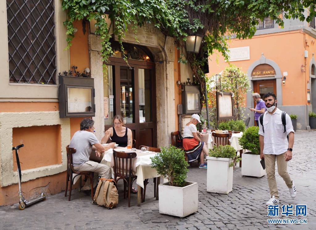 6月24日,人們在意大利羅馬一家餐館的戶外區域消費。